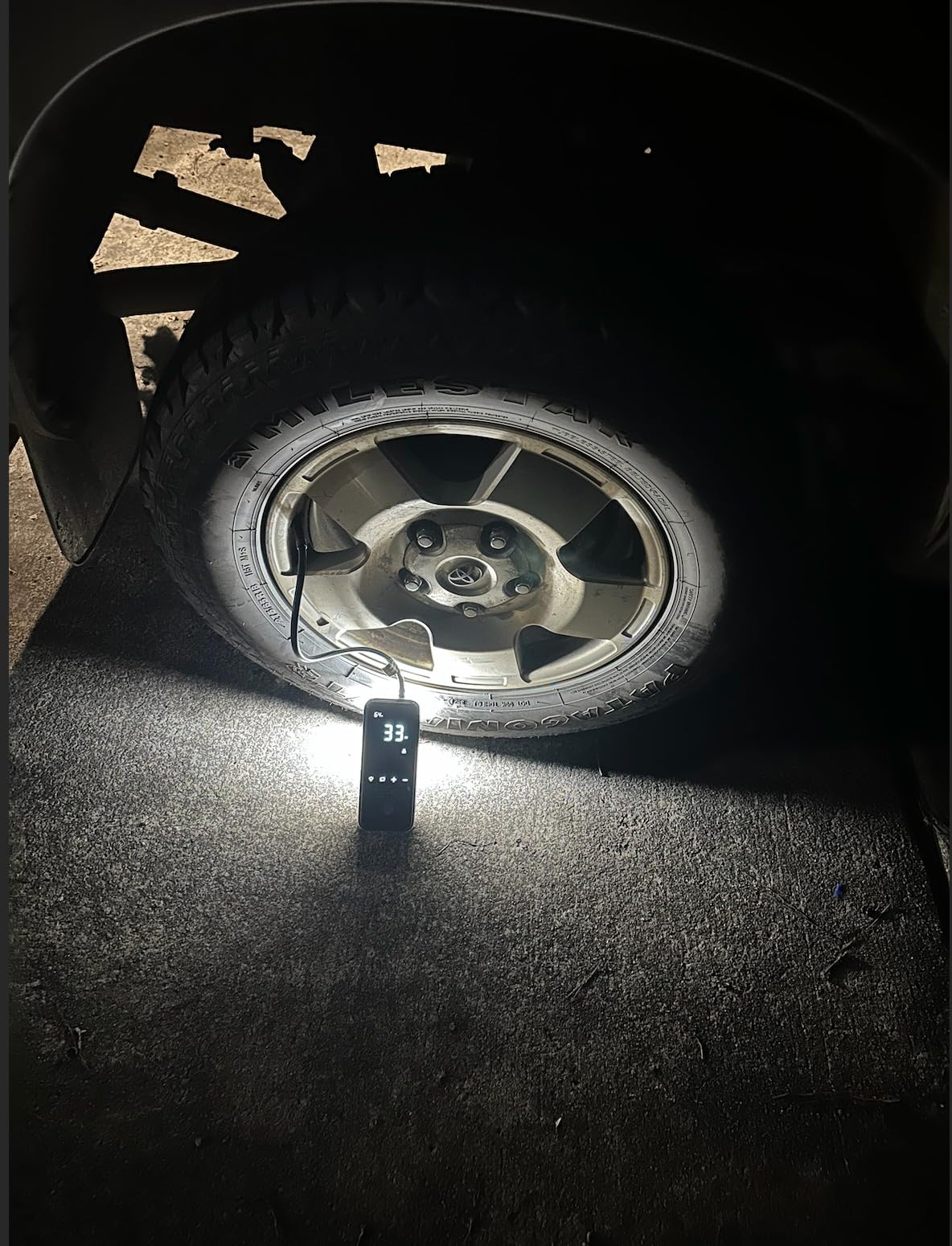 Of course! It has a built-in bright LED light that helps you see your tire clearly at night — very useful if you get stuck on the road or inside a dark compound.
