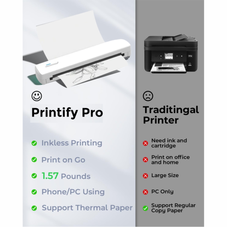 Printify uses thermal tech, no cartridges needed…No more running out of ink or spending extra. Save cash, avoid mess and print worry-free